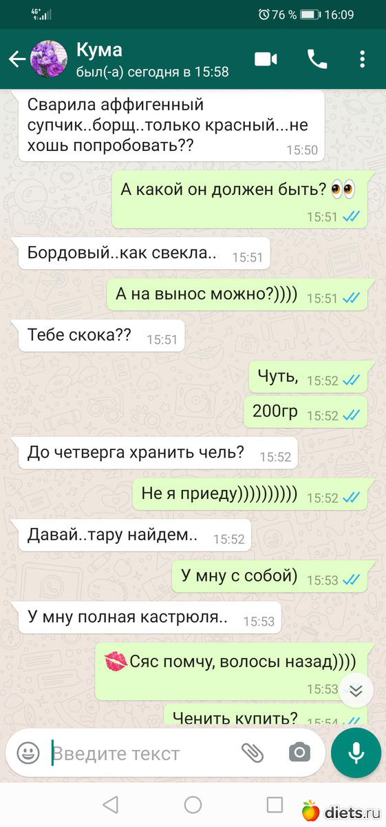 Решила раз морофонюсь то надо убирать ужин вернее перетащить его на полдник, так хочется квашеной капустки... Куриная грудка и киселек))) естественно обпилась потом((только сегодня с Лилей про супчик перекинулись и пишет мне кума... Ниже клочек переписки))) поехала к ней зашла в магаз и им конфетки купила(с ней живут два внука и двое приходят) захожу а там почти весь табор))) борща налили с собой)) а вот пироги с кампотом не смогла отказаться(((и сегодня какой-то поминальный день вышел, её маму мы весной похоронили а сегодня бы ей было 81 год... Помянули...