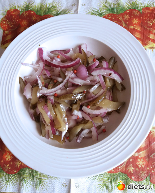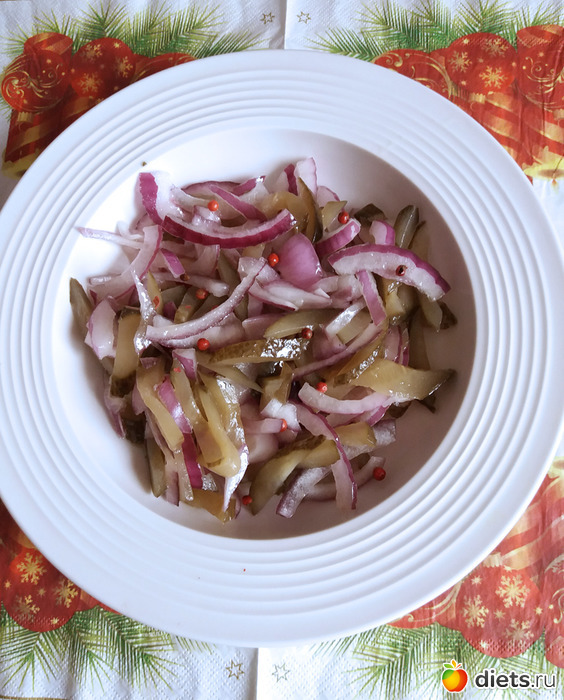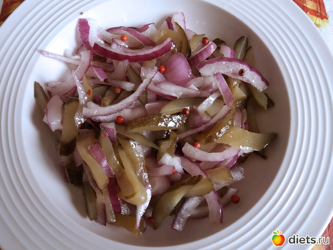 Я готовила именно из этих продуктов, но так же отлично этот салат дополняют соленые или квашенные грибы