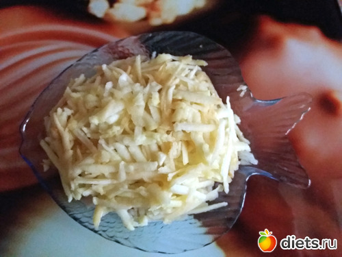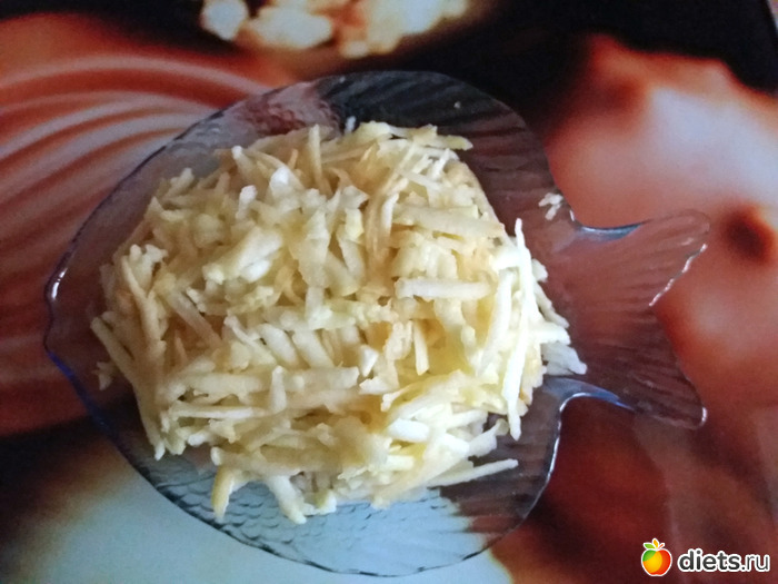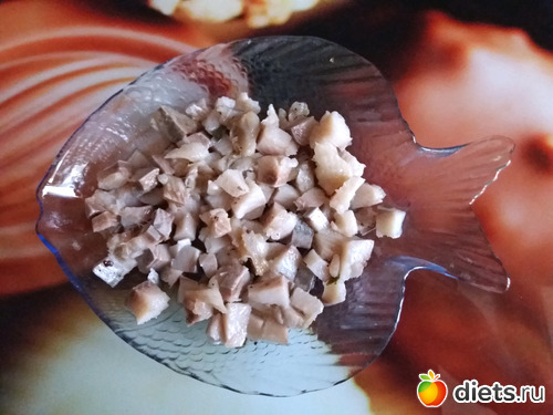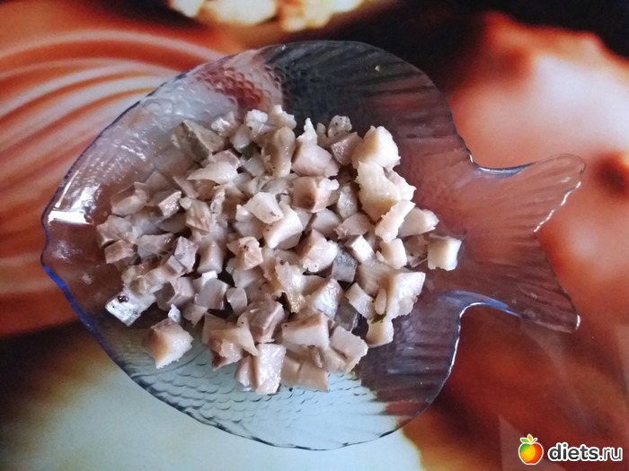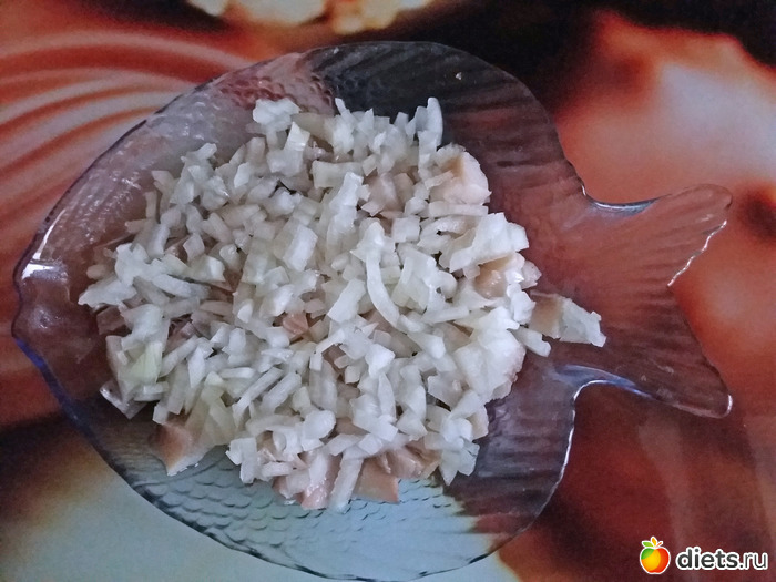 Приготовление стандартное. Филе сельди режем мелким кубиком. Лук тоже режем мелко.