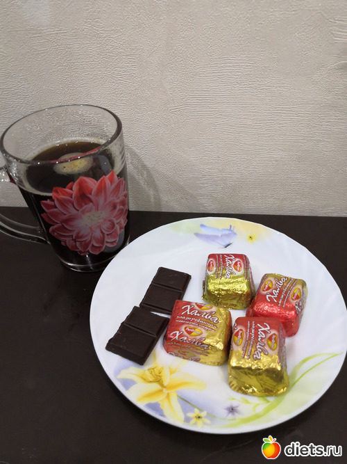 На ужин будут 4 конфетки халва в шоколаде и полоска горького шоколада, фото позже добавлю