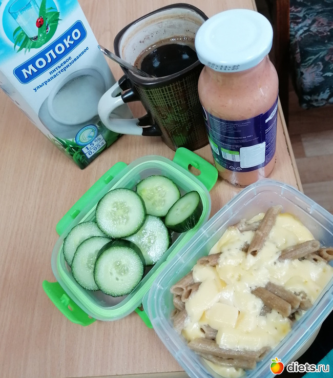 Обед, перья с полбы с сыром, огурчик, томатный сок(свой) с сметаной. Кофе с молоком не вошло потом попила с конфетками