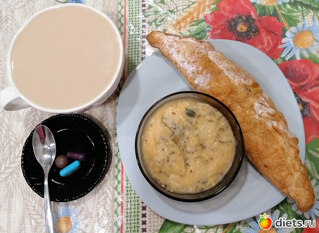 по простой причине-забыла вчера купить творог... С вечера наложила ’неженку’ своего производства туда семена чиа и свою посыпку. И с вчерашней кондитерки слоенка с банановый начинкой, кофе с молоком.