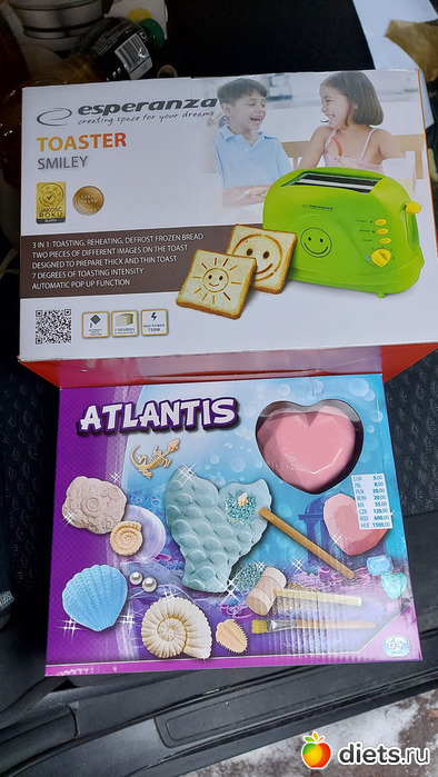 ). Докупили еще по 1 подарку детям: сыну тостер, дочке креативный набор по высвобождению "клада" из камня