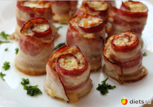 Теперь все совсем просто, берем нарезанный полосками бекон или копчёную грудинку, их можно купить в любом супермаркете. Кладем фарш на полоску мяса оставляя немного свободного края.