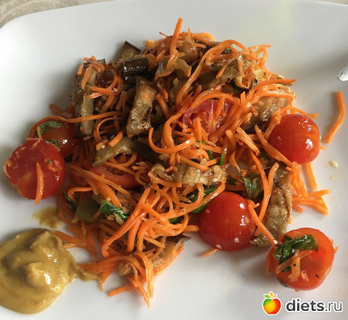 Типичные итальянские помидорки черри, базилик, оливки и баклажаны на гриле прекрасно сочетаются с морковью по-корейски, отсюда и название.