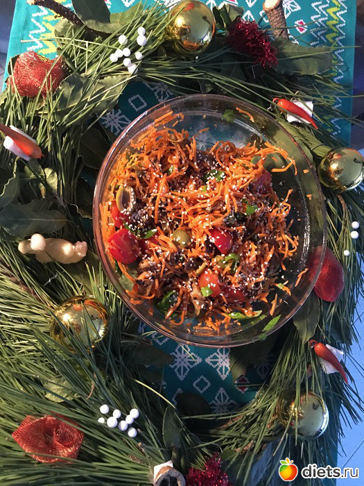 Очень легкий, сочный и красивый салатик (или кто-то посчитает его закуской), исключительно из постных ингредиентов, поэтому постящиеся могут приготовить его на Новый год. Прекрасно подходит к празднованию года Быка, потому что содержит только растительные компоненты.