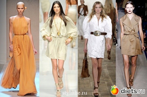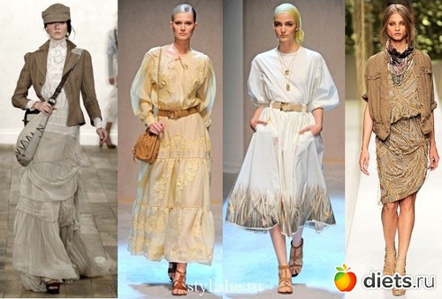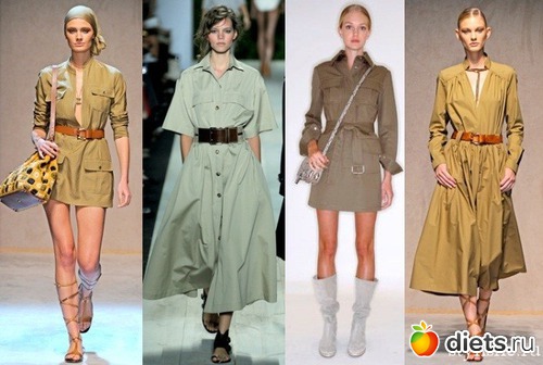 «Рубашечный», простой фасон платьев удачно скомбинирован с замысловатым покроем карманов, множеством различных пуговиц и стильной «фишкой» – элегантным поясом. В этом году самые модные платья – длиной от колена и ниже. Стройный силуэт, облегченные ткани природных оттенков позволяют гармонично сочетать платья с множеством аксессуаров.