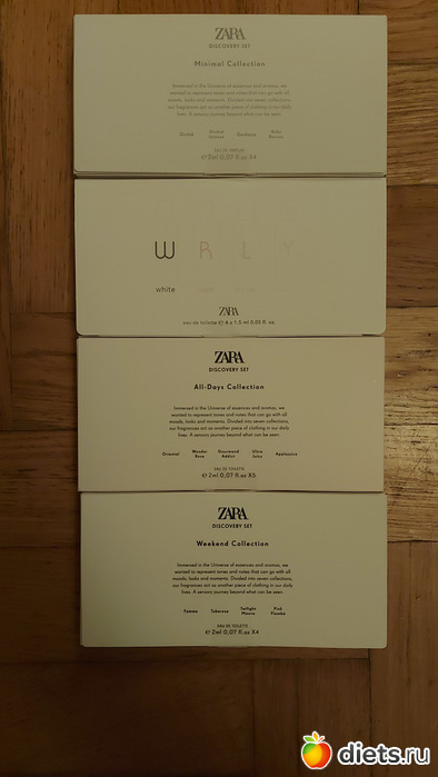 В общем, гуляла я по сайту Зары и вспомнилось мне, что уже не раз я слышала хорошие отзывы о парфюмерии Зара, мол копируют известные марки, только стойкость не очень. А для меня стойкость как раз не главное, я даже сознательно для работы выбираю очень легкие и ненавязчивые ароматы без шлейфа, т к общаюсь с большим колличеством людей и не хочу раздражать ничей нос. Выбирать один конкретный парфюм онлайн, по нотам и описаниям - вообще не мой вариант, поэтому я заказала наборы пробников. Взяла 4 набора, по 4-5 пробников каждый. Этих наборов у них вариантов 8 наверное на сайте. Теперь пробую каждый день по одному аромату. Получилось что-то вроде парфюм-адвент-календаря