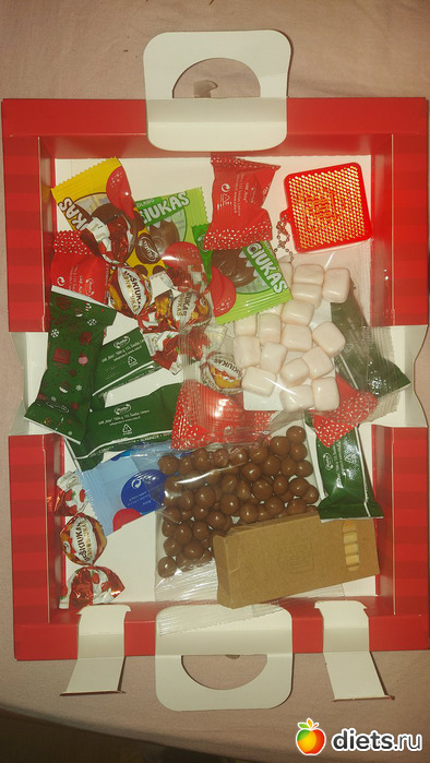 Мужу на работе тоже выдали детям сладкие подарки, но мы их не открывали. Обычно там ассорти киндеров - шоколад, яйца, бобы, ломтики и тп. Раньше была ещё мягкая игрушка, но последние годы только сладкие подарки - кризис(