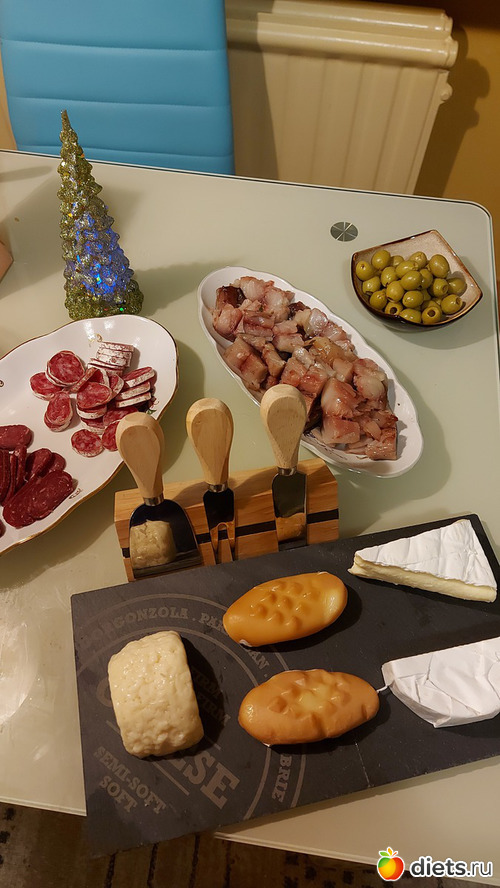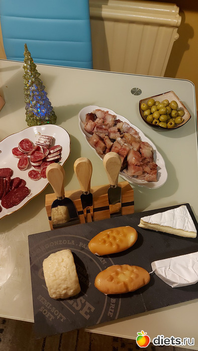 Ну и холодные закуски для всех: сыры, колбасы, скумбрия, оливки. Досточку с ножичками муж тоже нашел под елкой, это подарок от моей мамы, пришел по почте
