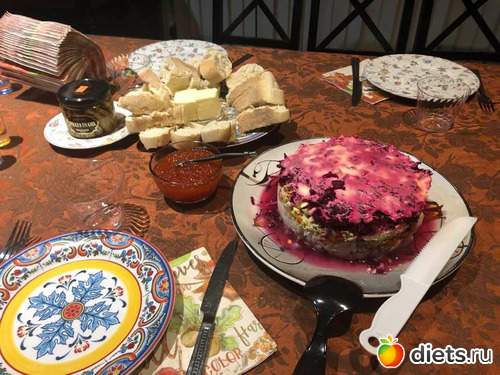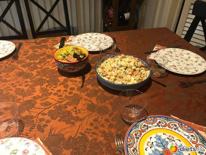 Вот такой у нас стол был. Я сделала классику - оливье, шубу, икру, курицу. Еще утку запекла, но она уже не понадобилась.