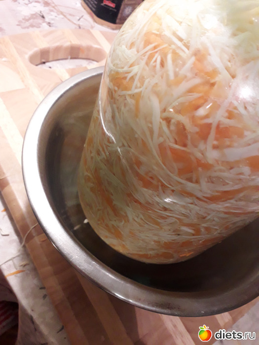 8. В процессе брожения в тазике или миске будет скапливаться рассол, после прокалывания капусты рассол из тазика я переливаю обратно в банку и так каждый день. Капуста будет готова через 6 дней т.е. я тоставила ее сегодня в понедельник значит доставать ее из банки я буду в воскресенье )))