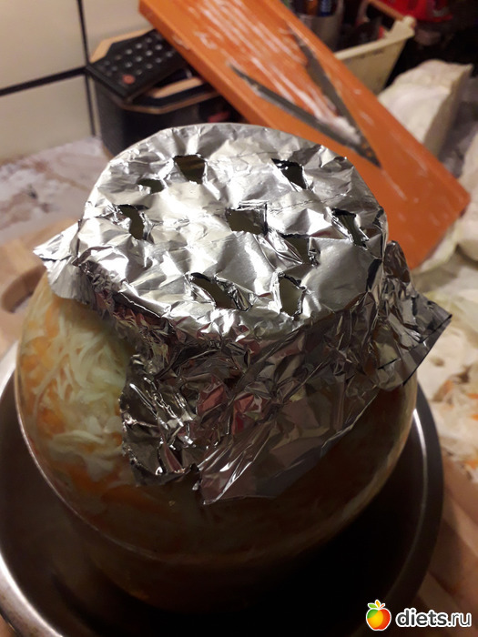 6. Ставим банку в миску или тазик, горлышко банки плотно закрвваем фальгой и делаем в ней отверстия. Затем всю эту композицию накрываем пакетом и не трогаем до послезавтра т.е. я не буду ее тревожить до среды...