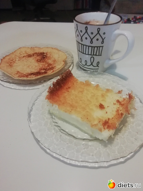 Кофейный напиток, овсяноблин и ванильный флан (который я с вечера приготовила)