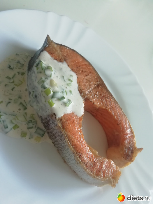 Слегка поджаренный стейк из форели с соусом с зеленым луком.