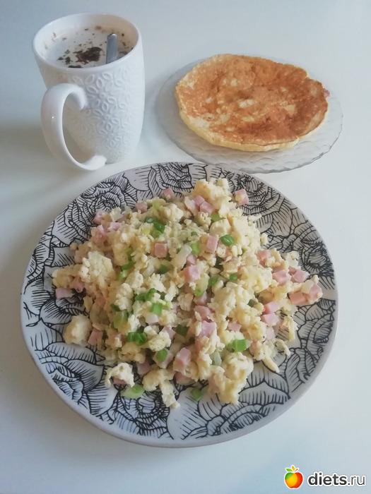 Овсяноблин, скрамбл (в тот раз с луком двух видов, уже хочется травки) и кофейный напиток на молоке.