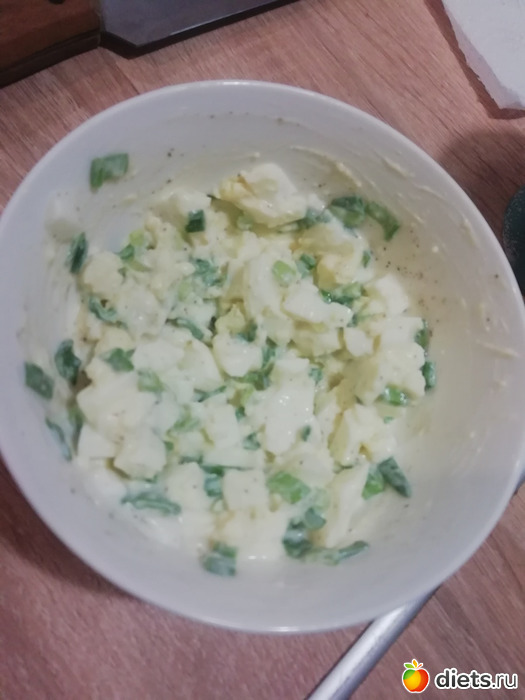 Выдался только после 5 но есть и не хотелось. Кусок индейки и вот такой типа салат- яйцо, зеленый лук, специи, соль, чуток кефира. Может сочетание и странно звучит но на вкус норм.