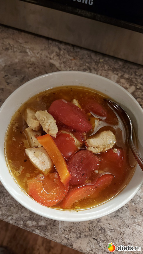 Все остальные ужины - суп том-кха, я готовила (кокосовое молоко, курогрудь, помидоры, болгарский перец)