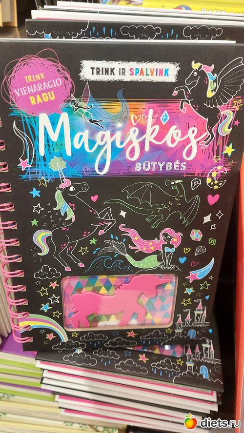 Еще вот такая книжка привлекла мое внимание, у нее страницы покрыты каким-то черным напылением, которое надо соскребать, а под низом будет цветная картинка. Причем соскребать предлагается... рогом единорога