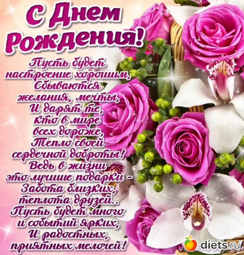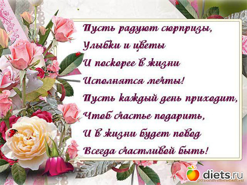 От всей души поздравляю тебя! Желаю тебе здоровья и счастья! Чтобы в жизни тебе сопутствовала удача! Всегда оставайся такой, какая ты есть! Сколько в тебе положительной энергии и человеческих достоинств! Оставайся всегда таким же душевным человеком!