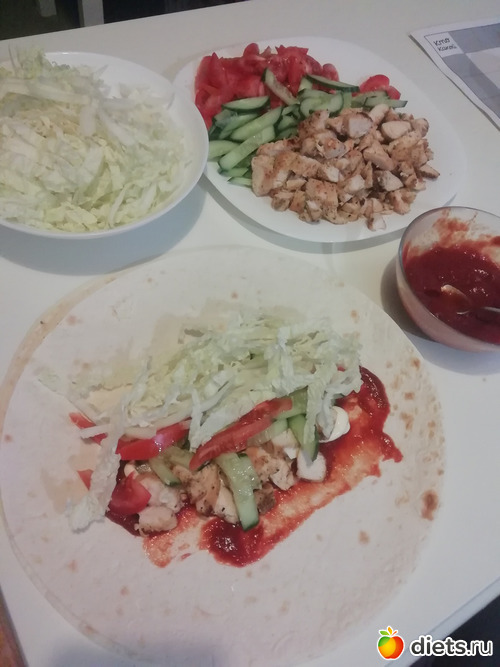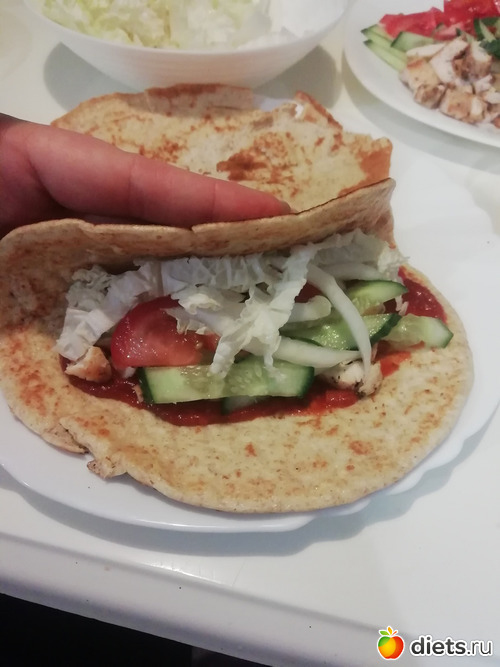 Я долго думала как мне заменит лаваш. У меня овощной день и все эти овощи с курицей мне можно, но не лаваш... В итоге я сделала пару лепешек по типу овсяноблина но с добавлением еще и пшеничных отрубей. Одна у меня разорвалась в хлам при попытке перевернуть (видимо я налила слишком тонко) а вторая, меньше диаметром, но толще, вполне сошла для моих целей. Так что обед состоял из 1,5 лепешки с овощами и томатным соусом и конечно мяса куриной грудки. Получилось оооочень вкусно. И я объелась.