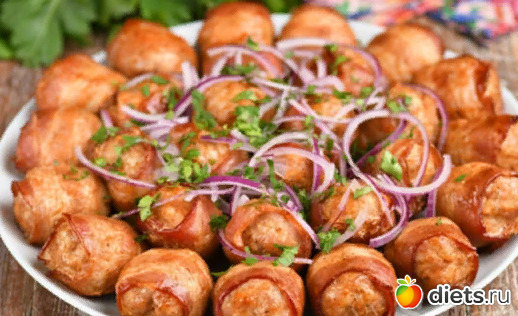 6. Зубочистки удаляем, шарики (тефтели) в беконе перекладываем на большую плоскую тарелку, посыпаем сверху репчатым луком, зеленью и сразу подаем на стол. Фарш при запекании покрыт беконом и получается сочным. Закуска сытная, выглядит празднично и на вкус бесподобная.