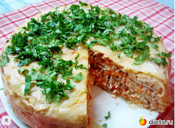 Подаём пирог-голубец нарезанным на порционные кусочки. Верх можно посыпать зеленью, полить сметаной.