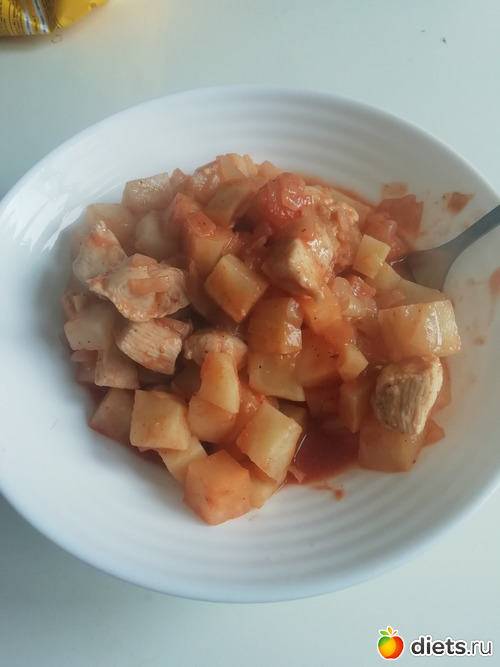 Так у меня получилось куриное филе, тушеное с луком и корнем сельдерея. Он очень напоминает картошку, но не такой крахмалистый и тяжелый, я очень люблю его пряный аромат.