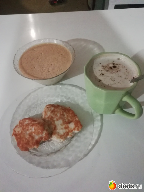 Кофейное суфле, кофейный напиток, пара куриных котлет без добавок.