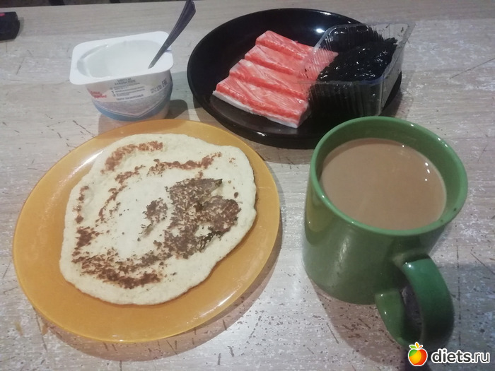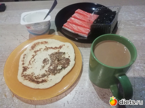Овсяноблин (ура! даже в полупоходных условиях он со мной!), несколько крабовых палочек, еще чипсы нори, кофейный напиток на молоке, полбаночки творога.