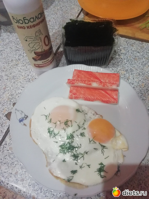 приготовила себе яишницу, съела несколько крабовых палочек с чипсами нори.