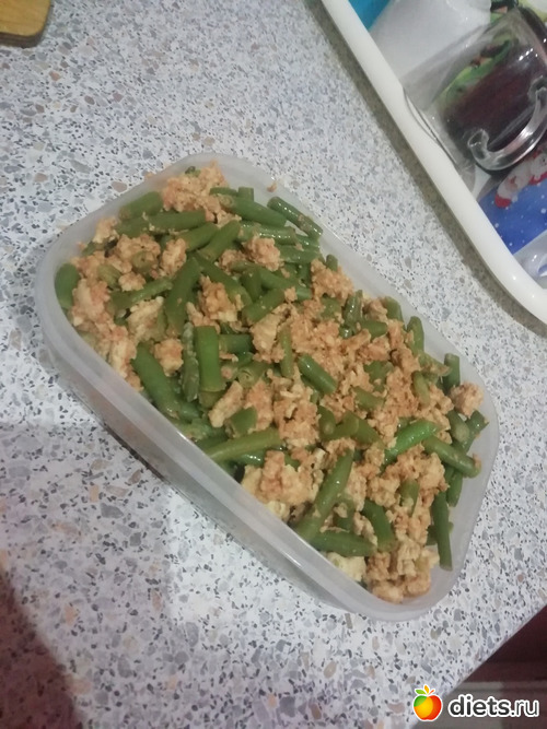 Потушила фасоль с томатом и куриным фаршем. У меня получился большой контейнер, битком..