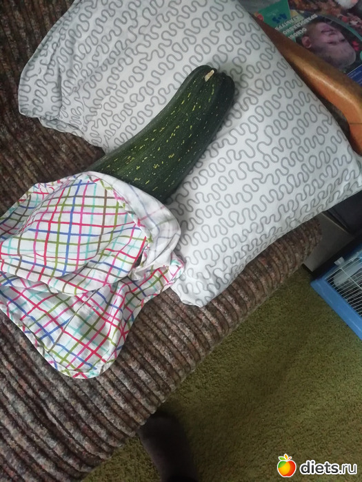 Уходя спать, обнаружила заботливо уложенный в постель и укрытый кабачок... Его мне торжественно презентовала мама, ну а младший позаботился о комфорте нового члена семьи