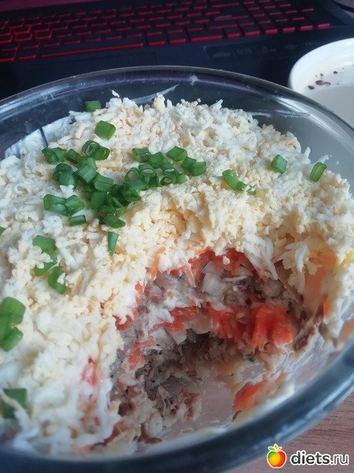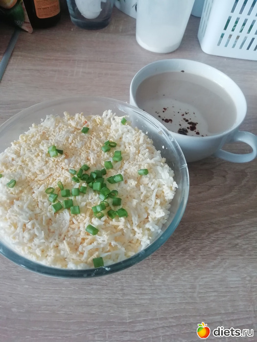 Салат вроде мимозы, кофейный напиток. Салата съела половинку мисочки и объелась Впервые попробовала изобразить майонез и получилось просто супер! Салат непременно буду еще повторять- пошел в самую душу!