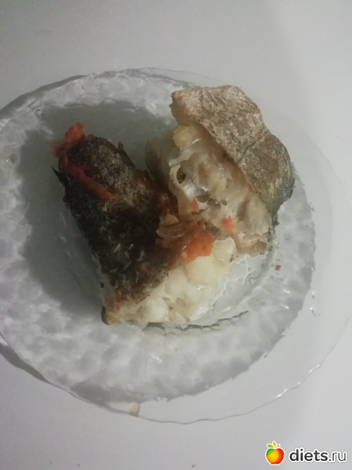 Рыба треска. Запекла ее с луком и морковкой, но ела в основном рыбу без овощей.