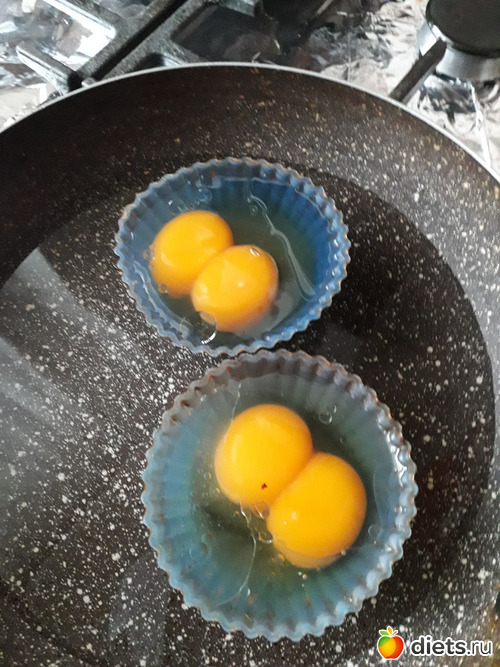 Смазать формочки любым маслом(совсем чуть-чуть), разбить в них яйцо. Ставим в кипяток, накрываем крышкой. На 2-3минуты(до 5 минут -в зависимости от размера яйца. Смотрите-как" схватится " белок- и готово!)