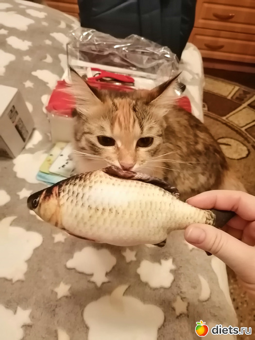 Тосян благополучно проспал распаковку, но потом тоже смог оценить рыбку (жаль телефона с собой не было).