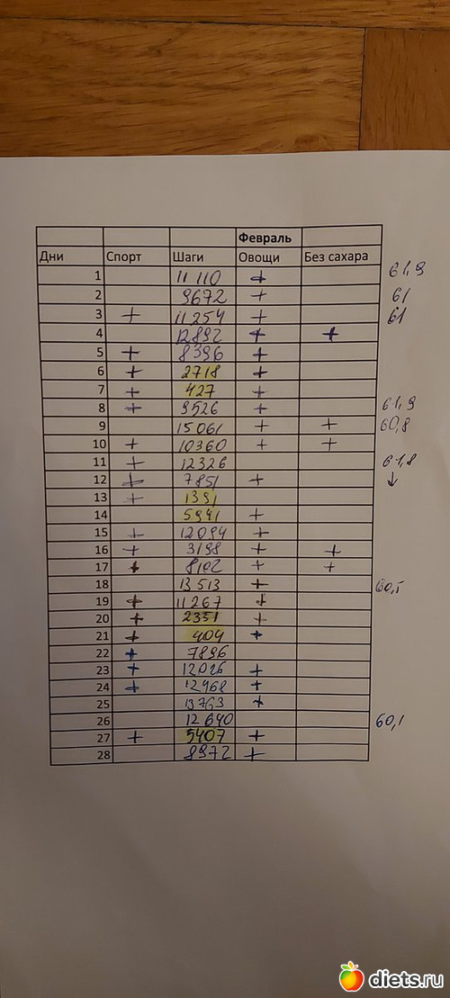 Только в конце февраля удалось увидет на весах 60,1 и то только потому, что днем раньше я вечером после работы была у дантиста и не ела ужин. Поэтому такой отвес, одноразовый