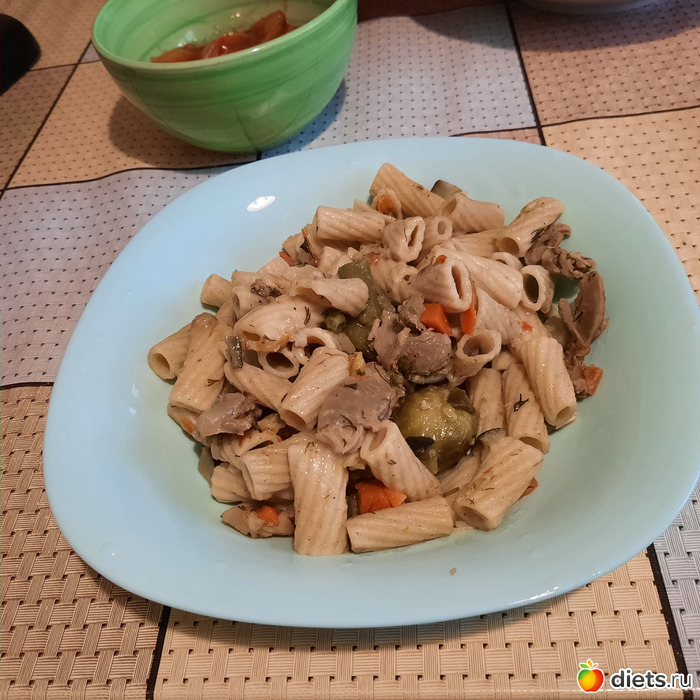 в тарелке - вчерашний ужин. ПП макароны+пупки (желудочки) куриные, тушёные в овощах от Бауэр.