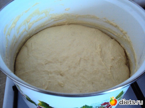 Перемешать, всыпать 500г муки, замесить тесто. Поставить в тёплое место.
