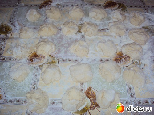 Затем тесто обмять на столе, присыпанным мукой и разделить на 25 кусочков.