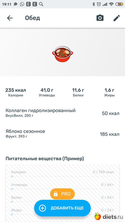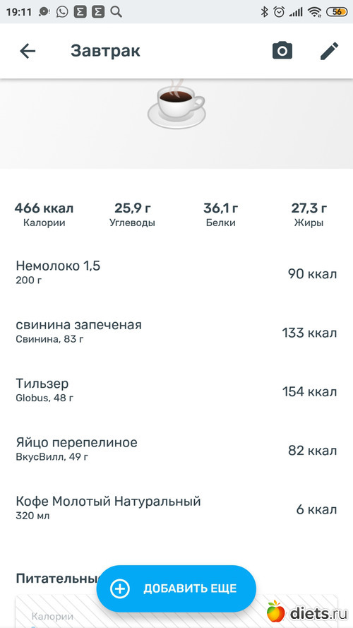 Посмотрела, что чуть недобор. Пометалась, что закинуть, чтоб среди ночи есть не приспичило, лучше сыра ничего придумать не смогла... И опять по жирам перебор вышел, потому что свой низкокалорийный сыр я доела вчера... Но общий калораж чуть пониже и до 19 уложилась.