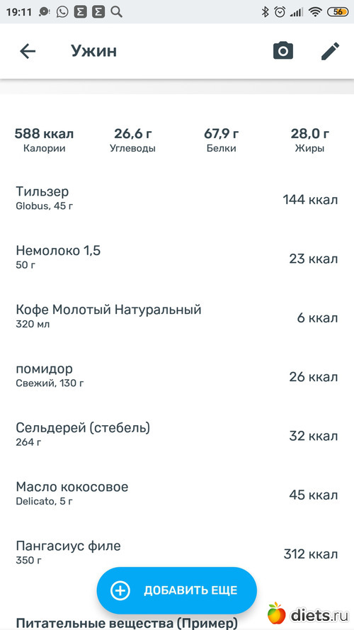 Кокосовое масло в ужине потому, что на нем жарила рыбу. Рассчет рыбы по сырому продукту, поэтому тут полкило еды)))