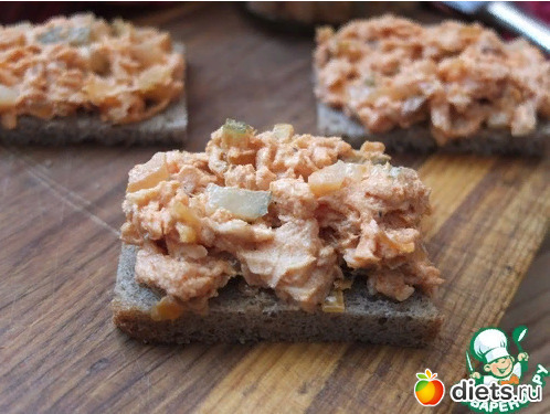 Продолжаю тему закусок, паст, паштетов и различных намазок хочу предложить вам еще один вариант рыбной закуски. Из простых ингредиентов получается вкусная, нежная, гармоничная закуска! Отлично будет смотреться просто в сочетании с хлебом, или в составе сэндвичей с хрустящими листьями свежего салата или в качестве наполнения для тарталеток!