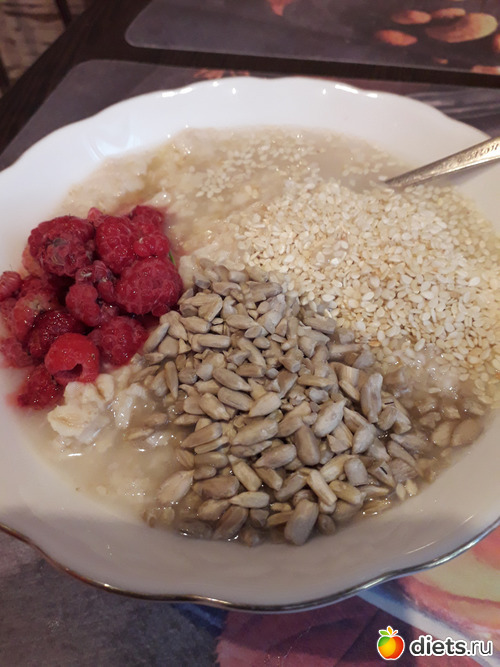 -Каша геркулесовая на воде с медом, семечками, кунжутом и ягодами