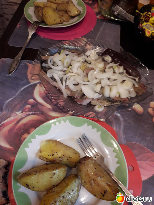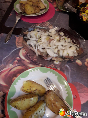 -Картошка по-деревенски, запеченная в духовке и селедочка с луком.