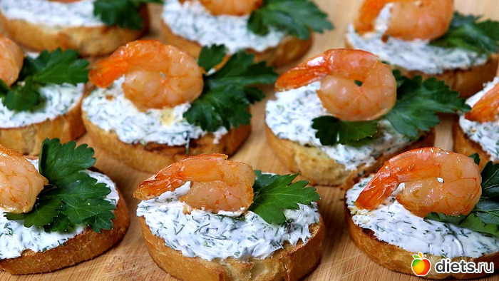 5. Намазку выложить на ломтики багета. Каждый мини-бутерброд украсить листиками петрушки и креветкой.