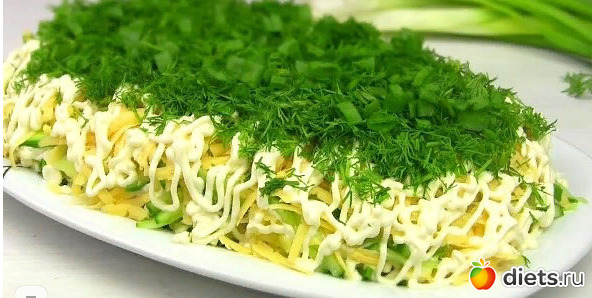 Отварной картофель натрем на терке и выкладываем третьим слоем. Делаем сетку из майонеза. Далее свежий огурец,1 небольшой или половинка. Нарезаем соломкой и выкладываем. Сыр натрем на крупной терке и выкладываем. Майонез. Укроп меленько нарежем и очень обильно посыпаем наш салат.