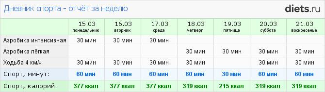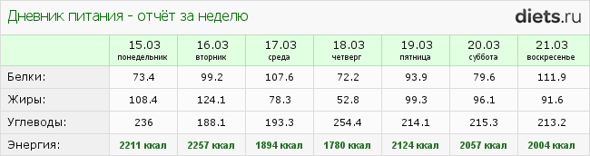 Не смотря на то, что два завтрака в неделю состояли из именинного торта, с калориями переборов не было. Даже 2 дня недобор.