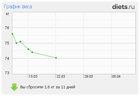 Результат недели 600 гр. Хотя видела на весах посреди недели цифру 73. Думала будет хуже, потому как в КД меня обычно наливает на 1-1.5 кг. А тут даже выше планируемых 400 гр. А еще талия уменьшилась на 2 см. Грудь и бедра пока не тронулись, грудь пущай и дальше не трогается, а вот за бедра обыдно, да.